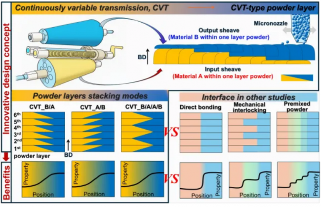 图1 受CVT启发的粉末沉积策略示意图,该策略用于在多材料LPBF中制备光滑连续的水平梯度界面。该概念通过对接两种不同材料的互补厚度梯度,实现了单层粉末内的成分过渡,与传统界面设计相比,能够实现不同材料之间更光滑、更连续的过渡。
