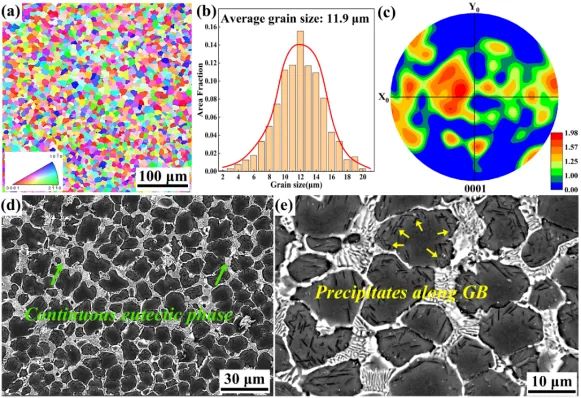 图1 沉积态VZ232K合金:(a)反极图(IPF);(b)晶粒尺寸分布;(c)极图;(d 和 e)背散射电子扫描电子显微镜(BSE-SEM)图像。