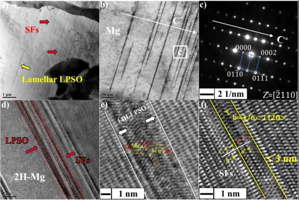 图2 LDED-T4 VZ232K 合金的透射电子显微镜(TEM)结果:(a、b)明场图像;(c)SFs 的选区电子衍射(SAED);(d)层状 SFs 和 LPSO 相的高分辨率透射电子显微镜(HRTEM)图像;(e、f)LPSO 相和 SFs 的反傅里叶变换(IFFT)。
