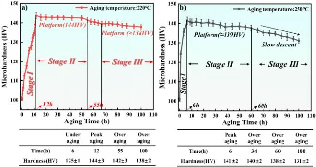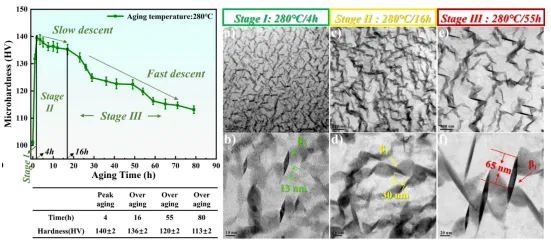 (3)峰时效态合金的卓越性能源于 β′相的超高数密度(2.4×10⁴ μm⁻²)与纳米级尺寸引发的强烈沉淀强化;过时效态形成的 β′相三向交叉互锁结构,保障了高硬度平台与300 MPa级屈服强度的长期稳定。