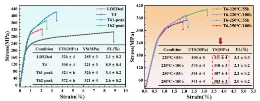 最近,北京航空航天大学李卓副研究员课题组徐哲博士等人采用LDED技术,成功实现超高钆含量(≈23 wt.%)Mg-Gd-Zn-Zr合金的高质量制备,通过系统的热处理与组织调控优化其微观组织,获得了优异的抗拉强度(425 MPa),并保持了较高的延伸率(3.4%),且受益于高Gd含量,合金在220℃、250℃长时间保温过程中性能退化缓慢,展现出优异的高温长时间使用潜力,为推动高强韧镁合金在航空航天等领域中的应用提供了材料和技术基础。