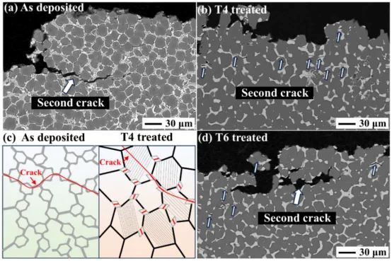 断裂机制:沉积态合金中(图6a),裂纹起源于硬脆共晶相,并沿晶界相互连接的共晶相网络扩展。连续网状共晶结构为裂纹提供了有效扩展路径,最终呈现典型的沿晶断裂特征。T4态合金(图6b)中,孤立岛状的共晶相区域出现大量二次裂纹,表明孤立岛状的共晶相在变形过程中发生显著塑性变形,同时α-Mg基体内高密度堆垛层错结构进一步提升了合金变形能力,这使得T4态合金断裂模式由沿晶断裂转变为穿晶断裂(图6c)。T6态合金(图6d)经时效热处理后,堆垛层错(SFs)转变为尺寸更大的γ′相,其协调变形能力下降,导致合金呈现沿晶与穿晶的混合断裂模式。