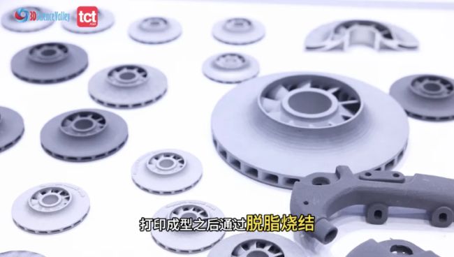 另外一台Flight403P设备原是用于高分子材料烧结的3D打印设备。无论是华曙还是友商都会感受到这类设备的发展没有金属设备快,为什么呢?主要因为这类设备之前大多只用于制造验证件和试制件,还没真正用于批产件。现在,华曙高科展示的是这台设备的全新应用——金属烧结打印。先打印成型再脱脂烧结,面向金属件批量生产。